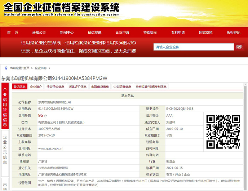 热烈祝贺东莞瑞翔机械获得AAA级企业信用等级证书