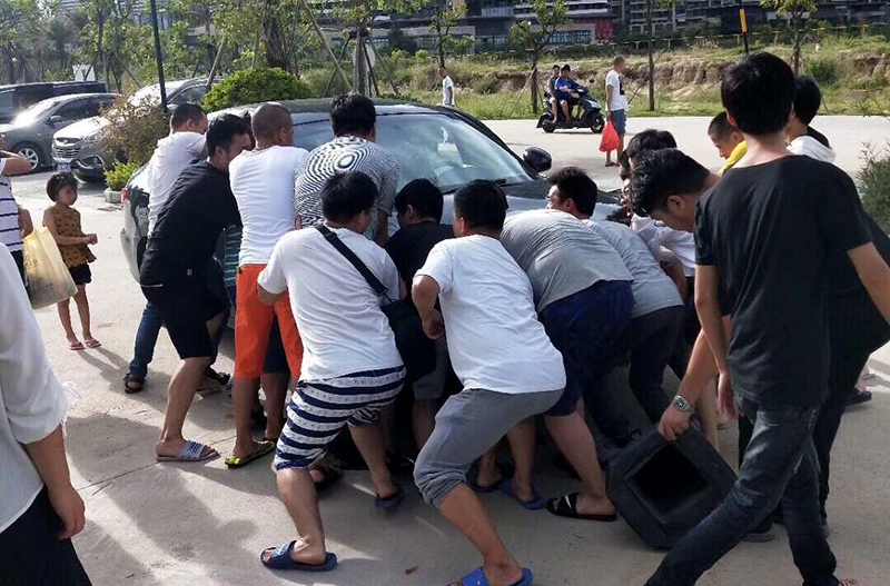 瑞翔兄弟们主动去帮司机把汽车抬出来,棒棒哒!