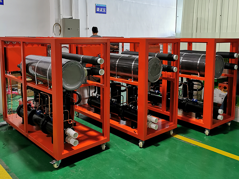 在电镀生产加工工艺中,由于电镀槽内溶液不断地产生热量,从而使溶液温度逐渐升高,当槽内溶液的温度高出工艺的要求时,会对生产出的电镀制品表面镀层的牢固度、均匀度、平整度及表面光洁度有着较大影响。因此,需要使用冷水机(冷冻机)提供冷冻水来冷却并保持电镀槽内溶液的恒温,保持电镀槽内溶液的温度恒定,将对电镀生产工艺及生产效率有较大提高。电镀液冷却,使金属、非金属分子稳定,冷冻机使金属分子随着稳定的电流快速贴附上镀件表面,增加镀件的密度和平滑,缩短电镀周期,提高产品质量。