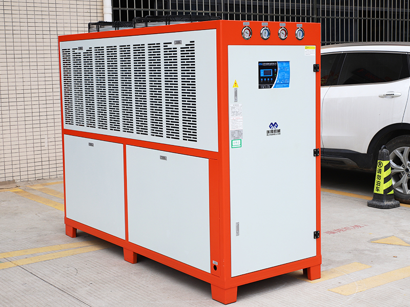风冷式冷冻机利用风扇给自身散热,不需要冷却塔。因为利用风循环散热,所以对环境要求高,如果车间的通风效果不好,或者冷冻机放置位置太靠墙,会导致冷冻机制冷效果不好或者高压报警。