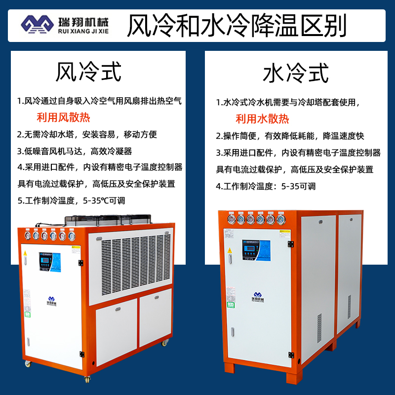冷水机是橡塑行业常用降温设备,具有降温效果好,容易操作,温度可设置的优点。冷水机分为水冷式冷水机及风冷式冷水机两种,如果已有冷却塔,需要更多降温效果建议客户购买水冷式橡塑冷水机,可以更大程度保证制冷效果。